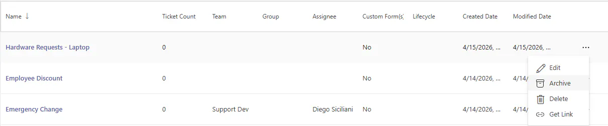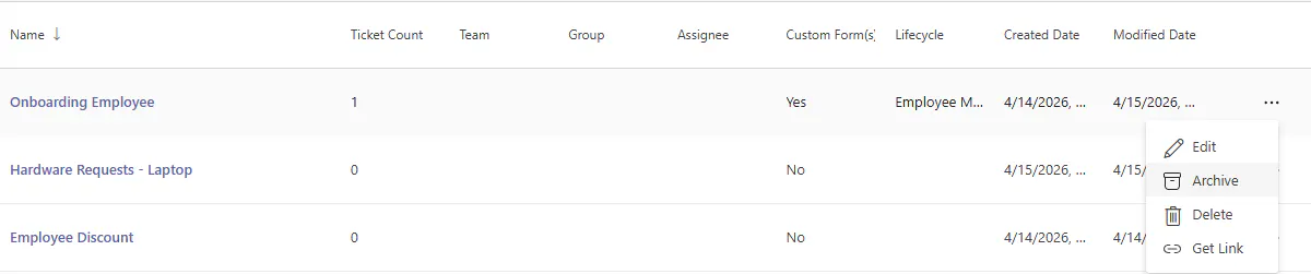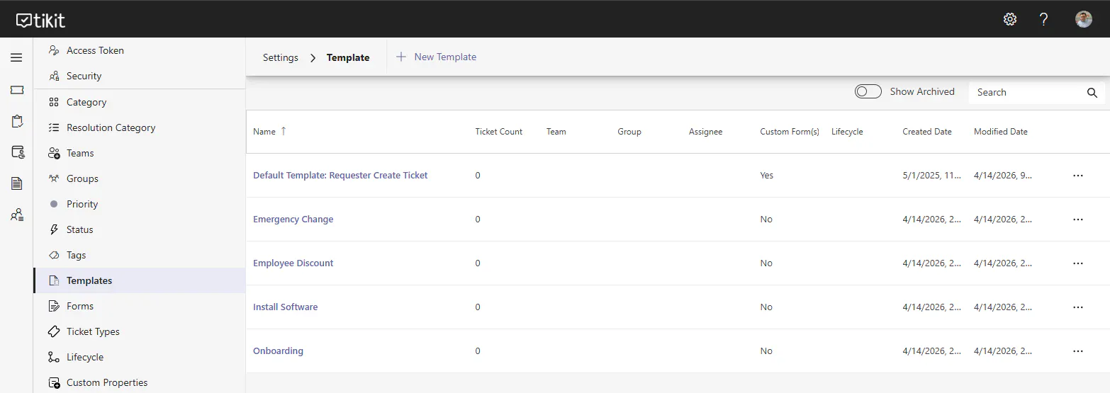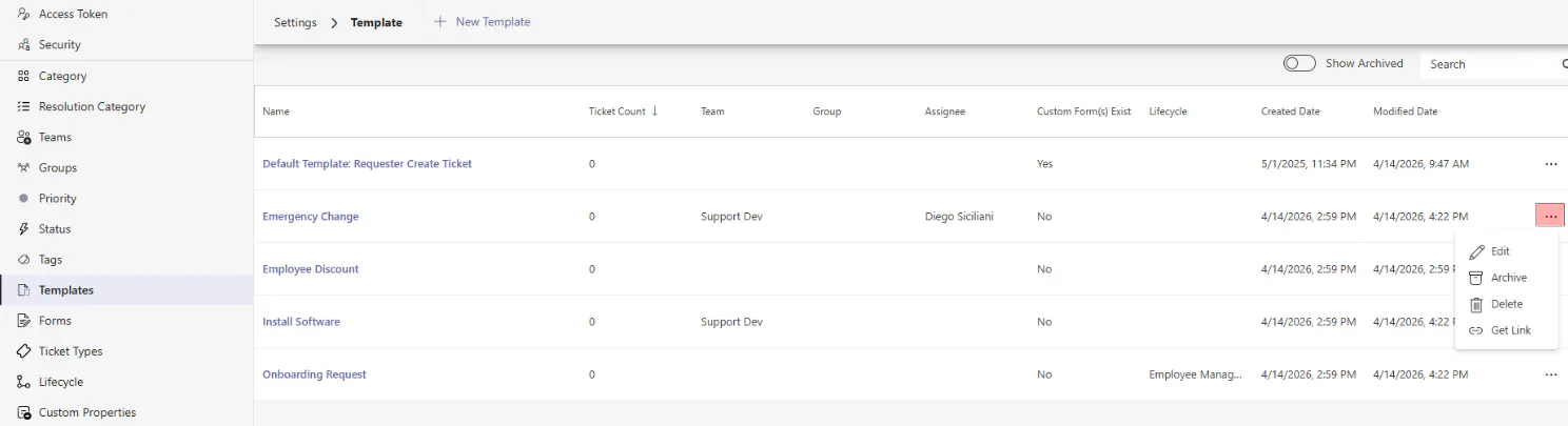 Need to retire a template? Templates can be archived to mark them as no longer available in the web app while keeping existing ticket counts for reporting.