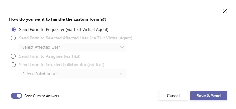 Depending on the role of the user within the ticket, they will receive a notification from either Tikit or Tikit Virtual Agent to fill out the form. When submitted, answers will overwrite existing form answers. The ticket Activity however will display a full audit trail of all of the answers/forms that were changed. By default, the current answers to the form are sent with the form for the user to see and alter. This can optionally be disabled so the user filling the form out starts from a blank form.